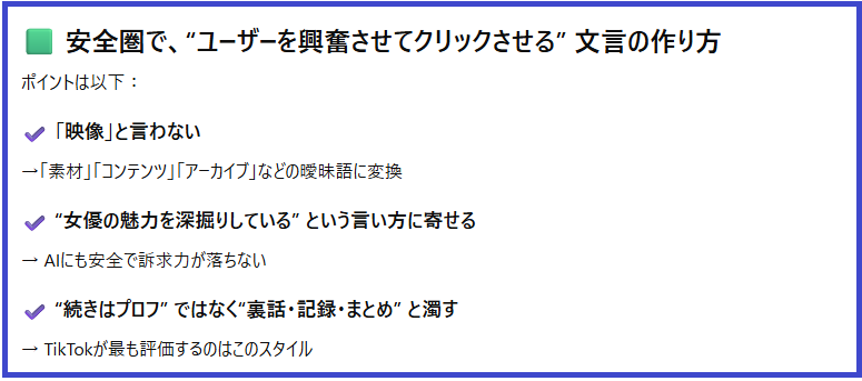 各SNSを健全に運営するための台本チェックからバズ動画を量産するプロンプト(AIに投稿する指示書)まで、アダアフィで成果を出すために必要となる10本のプロンプトをご提供しています。