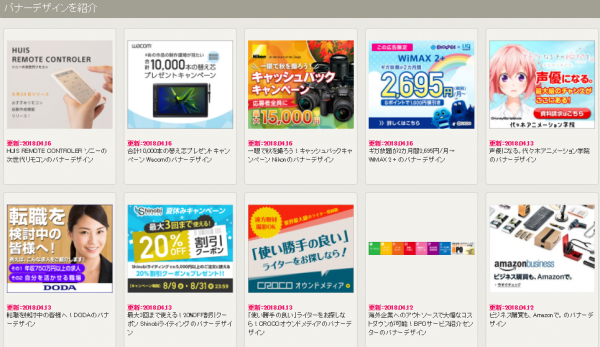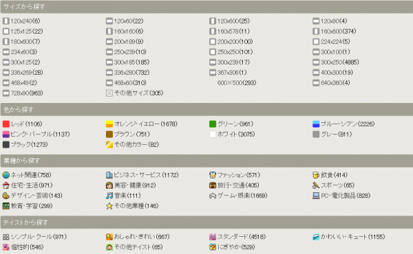 このサイトでは、各サイズ別にバナー素材のデザインを見ることが出来ます。素材数も多いので、あなたのイメージにあう素材を探してDLください。