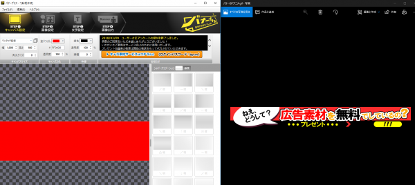 私は普段バナーを自作する際は、参考画像と画像制作ソフトを2つ並べて制作しています。このように真似するつもりでラフを制作し、あなたが謳いたい文言や素材を入れ替えてイメージに近いものを制作していきます。
