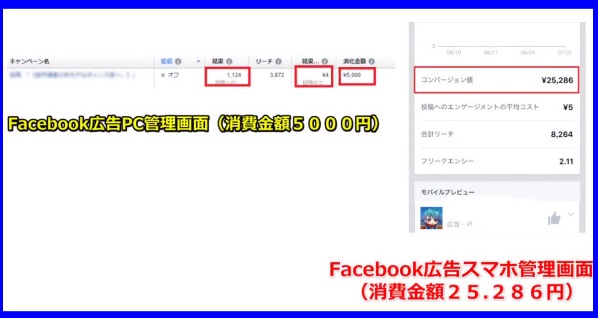 ・facebook広告PC管理画面(消費金額5000円)/facebook広告スマホ管理画面(消費金額25.286円)