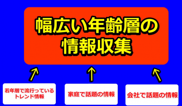 情報は上司から部下に降りてくることがあるときもあれば、同僚や友達、パートナーといった横のライン、又は部下や子供など下から上にと吸い上げられることがありますが、一番拾いやすい情報は若年層からの情報であり若年層の情報を上手に取得できれば幅広い年齢層の情報を取得することができるのですよね。