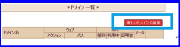 クリックしますと上記画面に移動しますので、青囲み箇所「新しいドメインの追加」をクリックしてください。