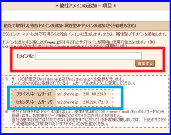 赤囲み箇所へあなたが取得したドメインを入力して「送信する」をクリックしてください。