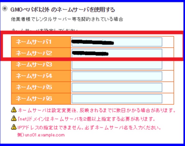 事項でWEBサーバーを契約してワードプレスの設定を解説しますが「四角囲み」のネームサーバーは必要な情報になりますので、メモ帳などに2つのネームサーバーアドレスを控えておいてください。