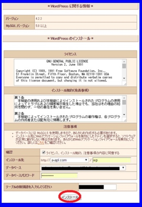 先ほど取得しましたドメインが表示されていることが確認できましたら「確認」箇所にチェックして「インストール」をクリック。