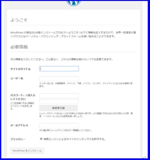 ワードプレスの登録画面に移動しますので、サイト名などの必要情報を入力して設定を完了させてください。
