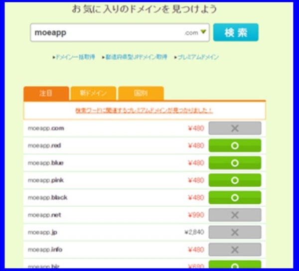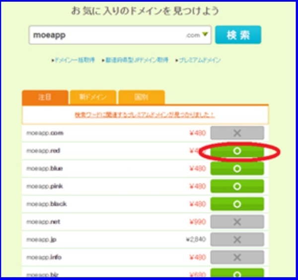 あなたの希望するドメイン名が購入できるようでしたら「○」をクックして購入手続きを行ってください。