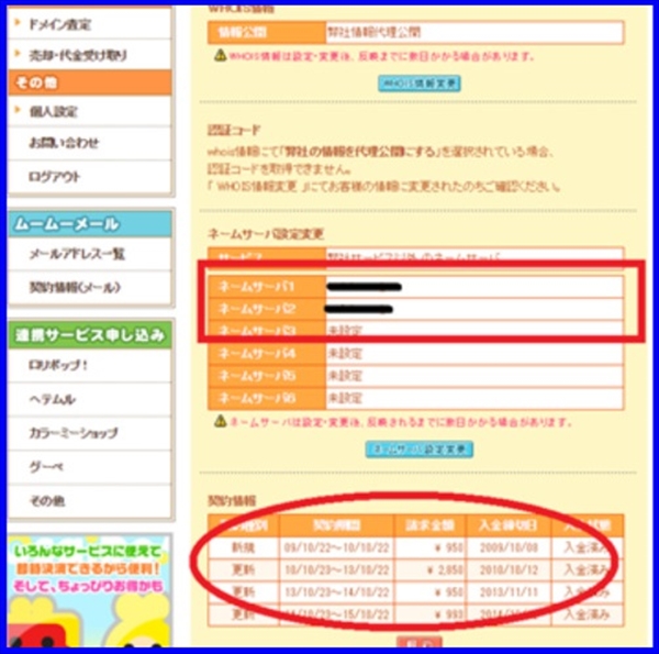 お支払方法は、サイトへログイン。ログインしていただきますと上記のように、今取得しましたドメインが表示されていますのでドメイン名をクリック。