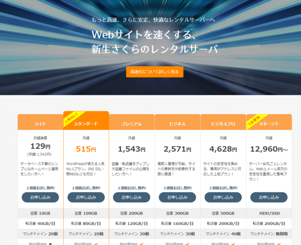 サーバープランは、ペライチのサイトを量産する、LPだけを制作する、専門サイトを運営という場合、ワードプレスが利用できる一番安価な「スタンダード」(月額515円)プランで十分です。