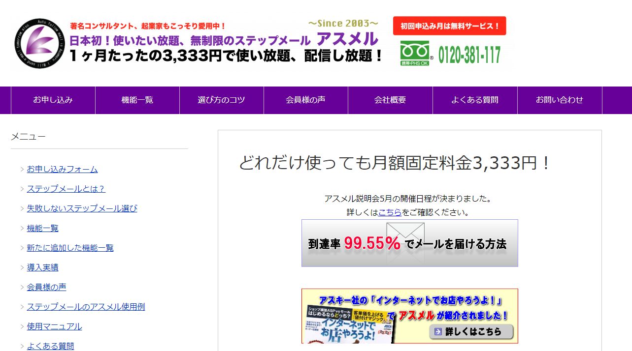 なんと使いたい放題で月額3333円の低価格で利用することが出来、到達率の高いと定評のシステムが老舗「アスメル」です。