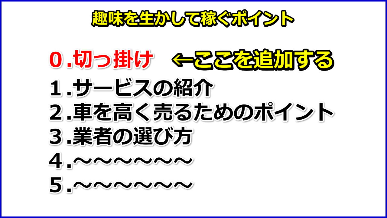 ↑このような必要な情報が順番に記載されているだけですが、趣味を生かして稼ぐ場合は、1の必要情報の前に「きっかけ」という項目を追加するイメージです。