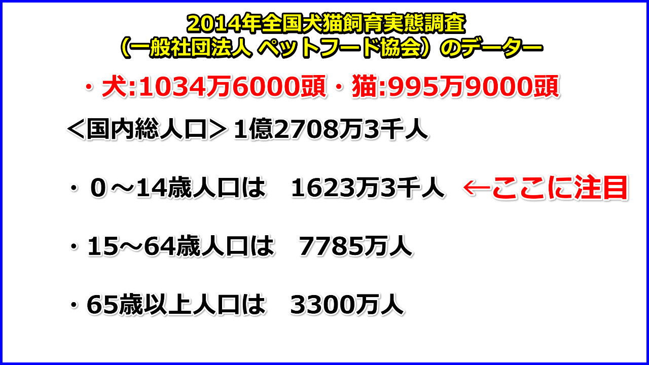前記の図解では15歳未満の子供の数より2000万頭を超えるペット(犬・猫)の数の方が多いですが、このデーターはペットは犬、猫意外にでの鳥やハムスター、爬虫類などは含みませんので、本当の市場規模はもっと大きいです。