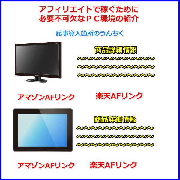 こんな感じが記事の項目となりますので、あなたが提供しているノウハウを実践するにあたり、最適なPCとモニターを紹介してAFを掲載してください。