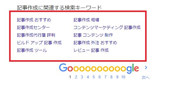 検索結果の下部に出てくる10個のキーワードが関連キーワードと呼ばれるものです。