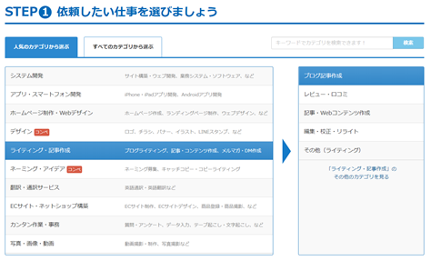 記事の依頼に関しては、「ライティング・記事作成」のところを選びます。ページ右部分は、ブログ記事作成や、記事・コンテンツ作成などから該当するものを選ぶとよいでしょう。