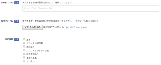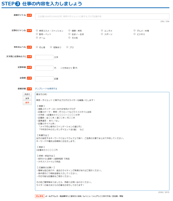 タイトルや文字数、記事単価、依頼したい記事数、仕事の詳細などを書いていきます。その他にも必要があれば、以下の内容も記載しておきます。
