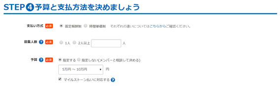 記事の依頼であれば、固定報酬制にチェックを入れて、何人募集したいのかを入力します。予算は、大まかな金額でも構いません。