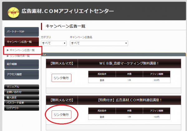 アフィリエイトコードの取得方法は、左メニュー「キャンペーン広告一覧」をクリック。続いて、あなたがご紹介するアフィリエイト案件のボタンをクリック。
