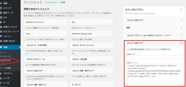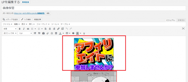 最後は表示を「ビジュアル」から「テキスト」に切り替えて、いま制作した画像のURLをコピペしてウィジェットの広告枠に張り付け完了です!