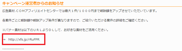 バナー素材は、アフィリエイトセンター管理画面へログインしていただきましたら、TOPページの上部へ素材DL用のURLがありますので、こちらよりお好きな素材をご活用ください。