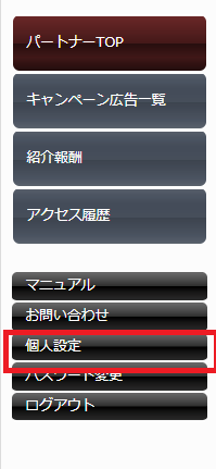 双方の共通事項になりますが、広告素材.COMアフィリエイトセンターへログインしてから、一番はじめに行っていただきたいのが、左メニューにあります「個人設定」です。