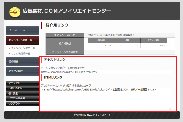広告素材.COMアフィリエイトセンターは、「広告素材.COM 無料メール講座!」を始め、当社で提供しているサービスを販促する目的で開設しました、オプトイン(無料登録)専門のASPになります。