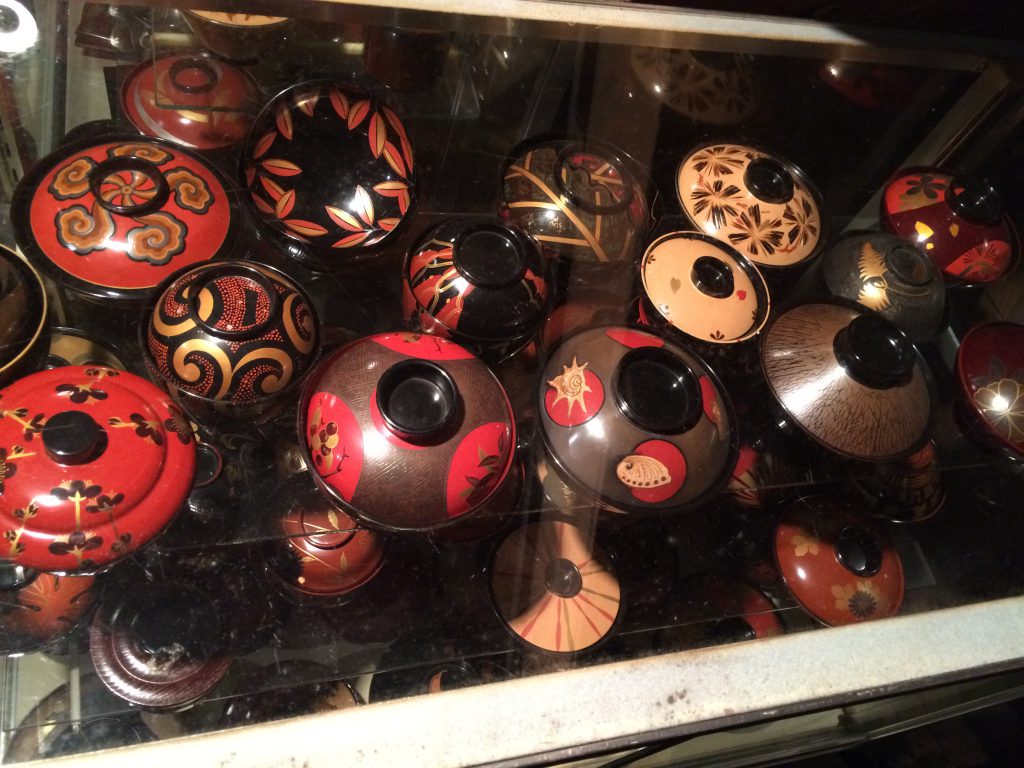 ↑街一番の老舗というお店で100年以上前の輪島塗を見学させてもらったのですけど、全然色あせることにない輝きでした。輪島塗が「一生もの」といわれる所以ですね。