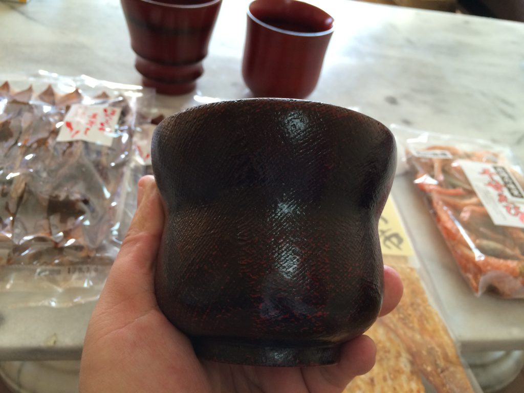 ちなみに、輪島塗は布を一枚素材に巻き付けて、絵柄を書くことが多いそうで、私が朝市で3500円也で購入したものの上に金粉を塗るとお値段が50倍になるそうです(笑