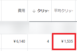 ↑2日目1クリック1535円で4クリック日計6140円/コンバージョン0件(滝汗