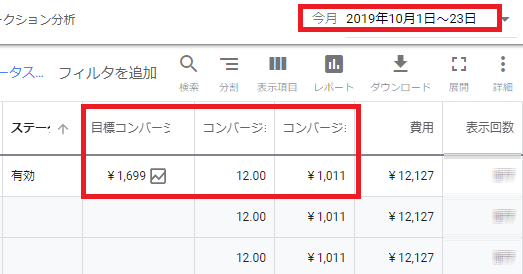 結果、1クリック3000円とか目が飛び出るほど高額なクリック単価になる時もありますが、とある商品購入のGoogle広告のキャンペーンでは1699円に設定開始し、先月ではCV単価が1800円、今月のCV単価は1000円程度となっています。