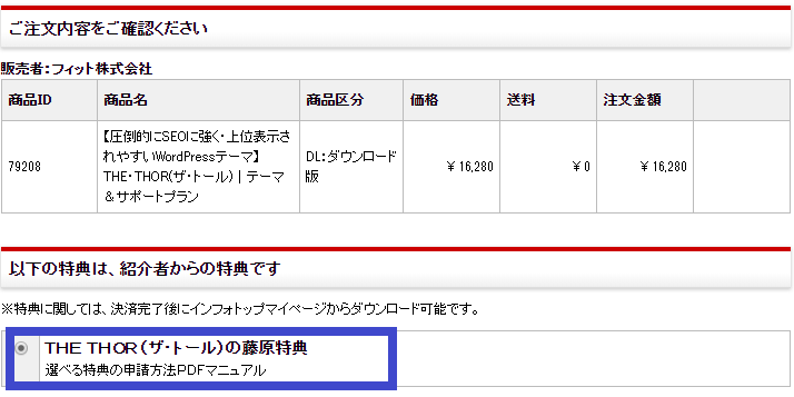 THE THORはインフォトップの決済を利用しています。このブログからのアクセスしますと上記のように私からの購入者特典が表示されていることをご確認の上、特典申請PDFをDLしてください。