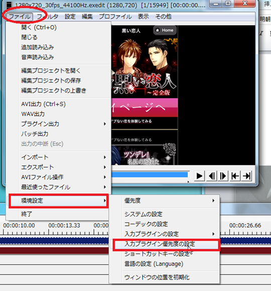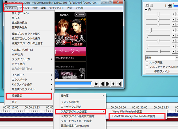 上部メニューより「ファイル」⇒「環境設定」⇒「入力プラグインの設定」⇒「L-SMASH Works Fell Readerの設定」の順番で進んでください。