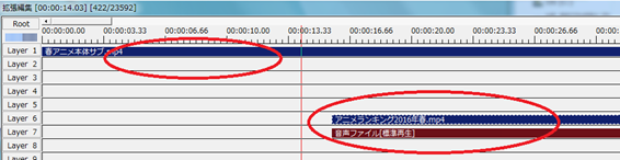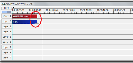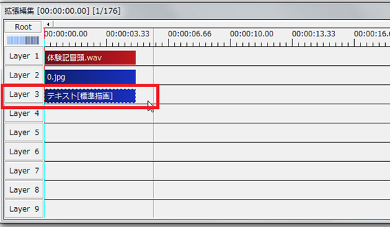 Layer3にテキストが表示され、図のような画面になりました。先ほどの素材調整で3つの素材の末尾を合わせます。