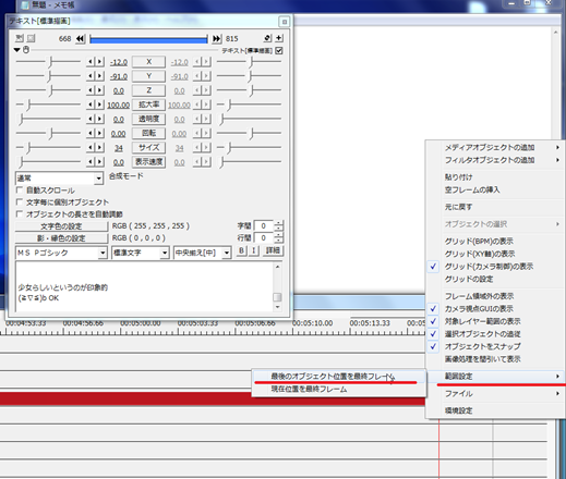 「範囲設定」(図の赤線部分)⇒「最終オプジェクト位置を最終フレーム」(図の赤線部分)を順にクリック。