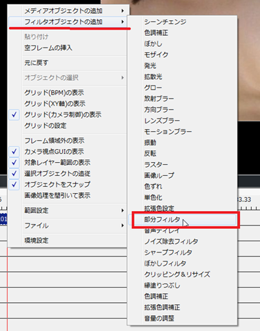 モザイクの設定をするには「Layer」にマウスで指定箇所を右クリックし、フィルタオプジェクトの追加⇒部分フィルタ指定してください。