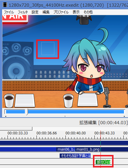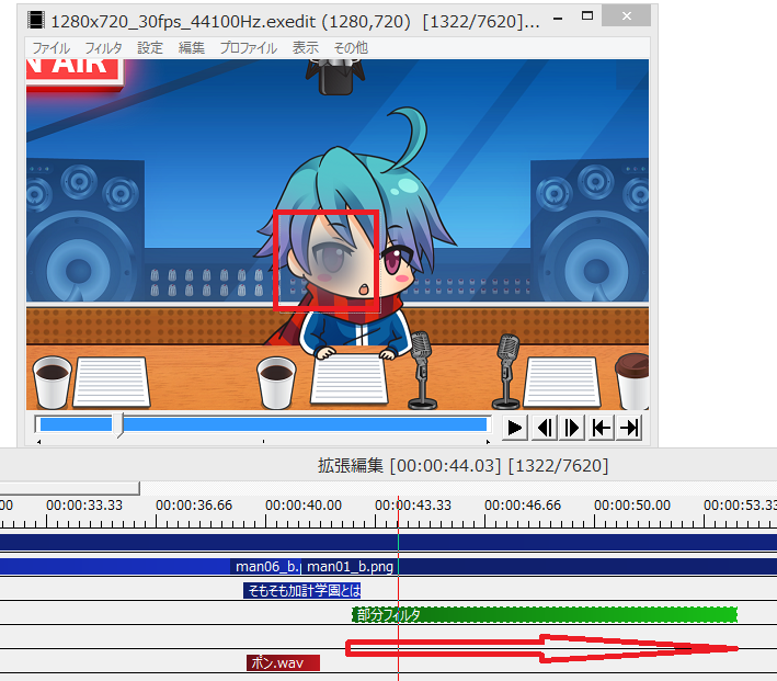 修正を行う際は、再生ウィンドを一度止めて、拡張編集に表示されています「赤の縦線」を左右にスライドをさせて修正個所をクリックし、今までと同じ流れで編集を行います。