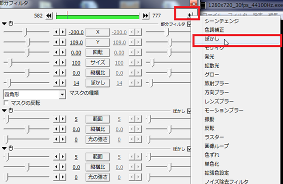 あなたがモザイクしたい箇所へ四角点線を移動させましたら、上記編集画面の「+」をクリックすると「ぼかし」という項目がありますので、ここをクリックしてください。