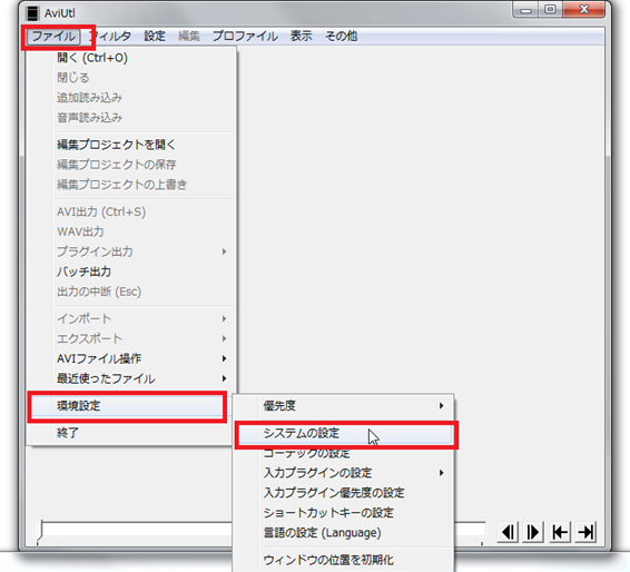 上部にある「ファイル」(図左上□部分)⇒「環境設定」(真中□部分)⇒「システムの設定」(一番下の□部分)の順にクリックします。