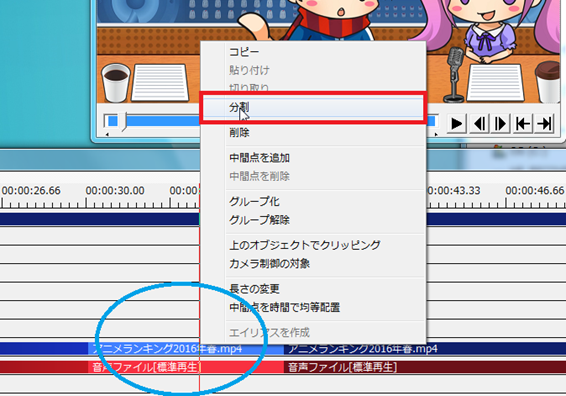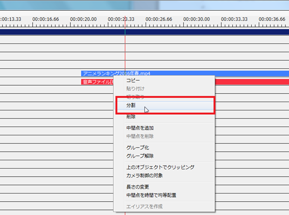 同じように不要と思う個所の末尾を指定し、右クリックしてメニューより「分割」を選択します。
