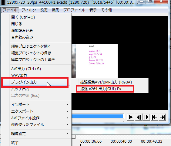 動画が完成しましたら、上部メニュー「プラグイン出力」を選択し、「拡張×264出力(GUI)Ex」をクリックしてください。