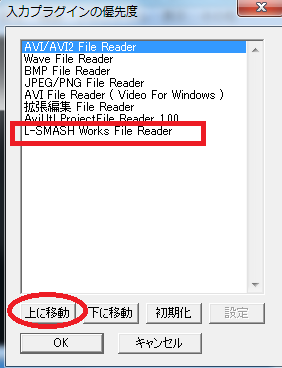 「L-SMASH Works Fell Reader」を上から3番目に移動させ、アップロードできるか試し、アップロードできない場合は降下順に順位をずらしてアップロードできる状態で調整します。