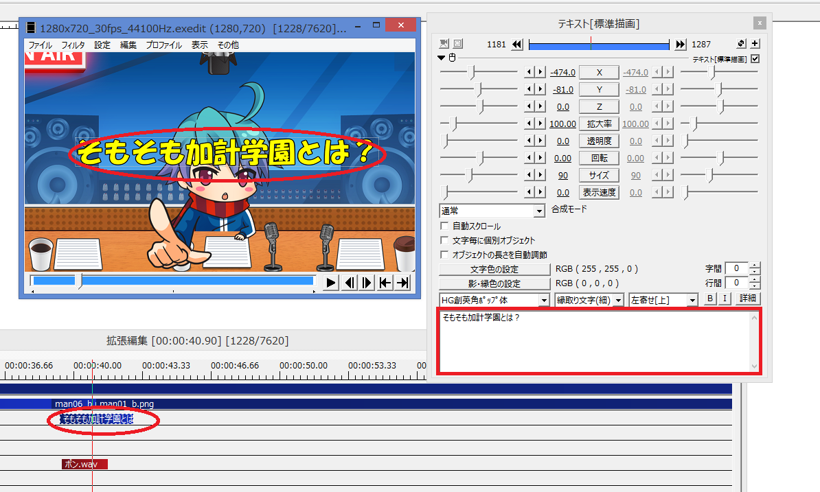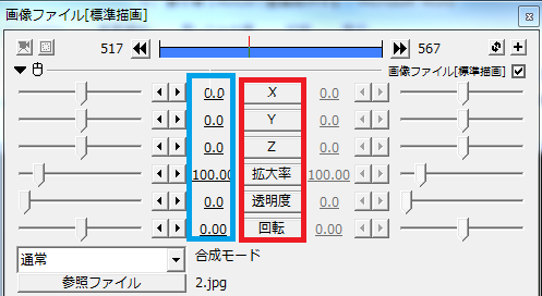 青囲み個所が「位置指定」になります。サイズ違いの画像、キャラクターを組み合わせる際は違和感がないようにここで「数字」を合わせて設定します。
