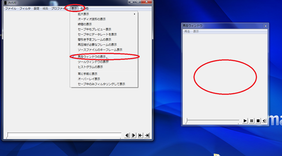 同じように、上部メニュー『表示』をクリック⇒『再生ウィンドの表示』をチェックしますと表示されます。(図の○部分)