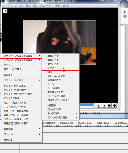 表示された「メディアオプジェクトの追加」⇒「テキスト」の順に(図の赤線部分)をクリックします。