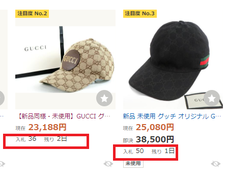 ↑この帽子でいえば2万3千円以上でもうすぐ落札されますので、1万8千円で同じ商品を仕入れれば5000円の儲け。