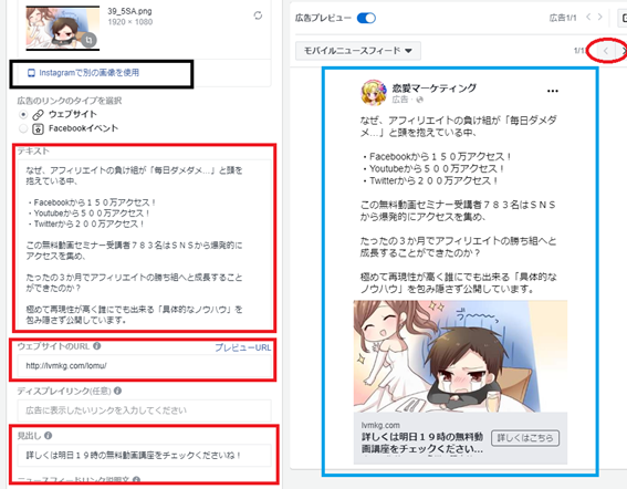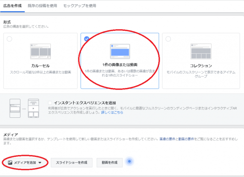 最後は広告作成画面になりますので、上部囲みを選択し、下部囲みで画像や動画をアップロードします。