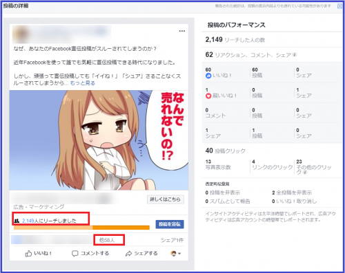 Facebookページの投稿のリーチ(表示)数を伸ばす広告です。ターゲット選定した見込み顧客(地域を含む)へあなたの投稿を表示させる目的の広告です。