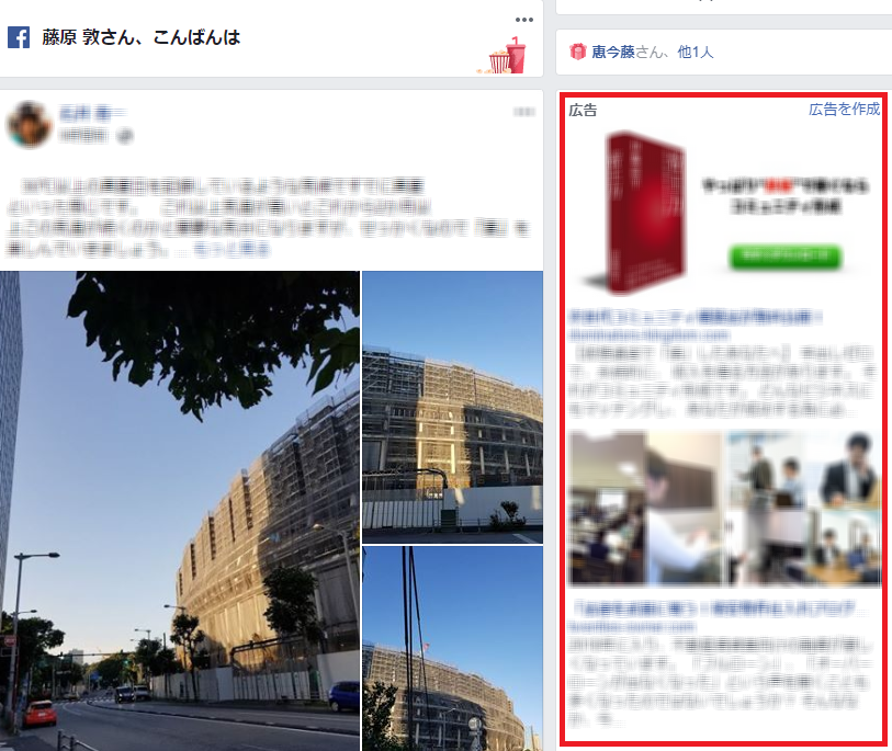 なぜかと云えば、Facebook広告ではターゲットのタイムライン上にFacebookページ名で広告が表示されるからです。