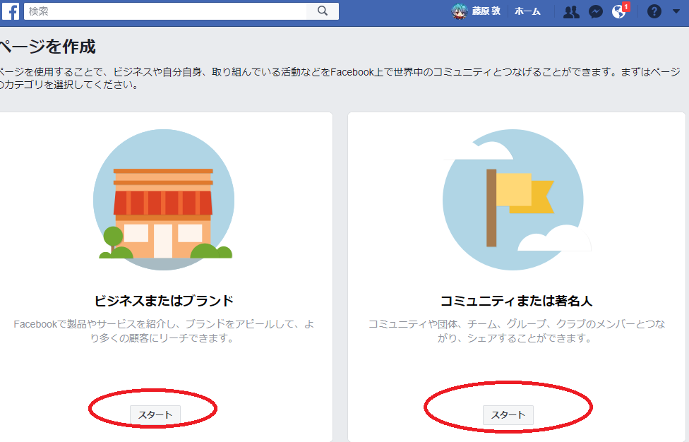 Facebookページを開設するには、Facebookの上部メニューから「ページを作成」を選択しますと以下画面に移動します。