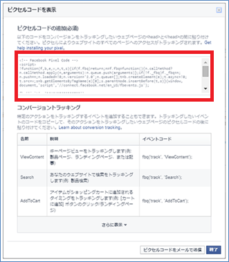 またピクセルは、イベントごと(購入やカートに追加など)設定できますので、あなたがコンバージョン測定したいイベントを選択し対象タグを設定ください。